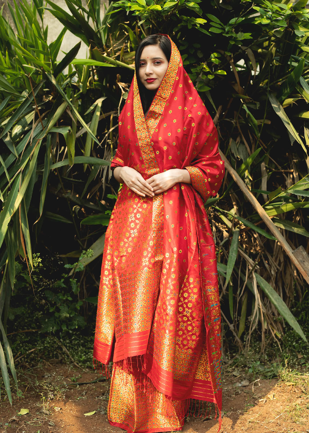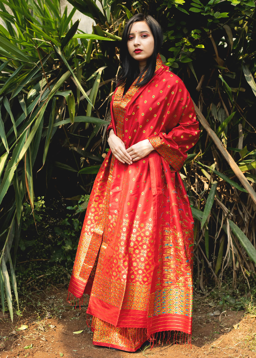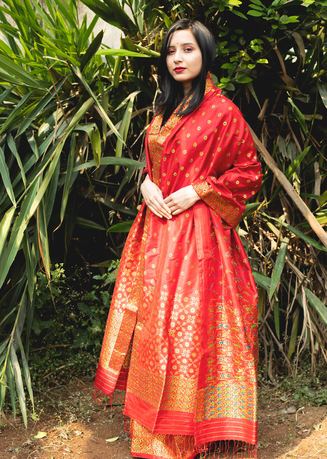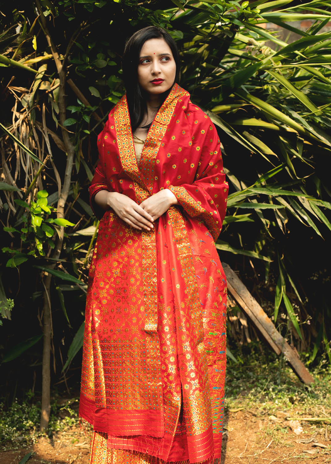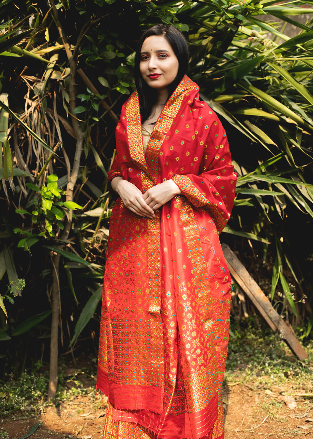 Presenting Sereki’s all time handloom masterpiece that is extremely glorious and worth your closet’s share. This bright red coloured zaali design with gul buta addition spreaded across our Swastika gold paat/mulberry silk mekhela sador from our bridal trousseau is surely a piece to own.