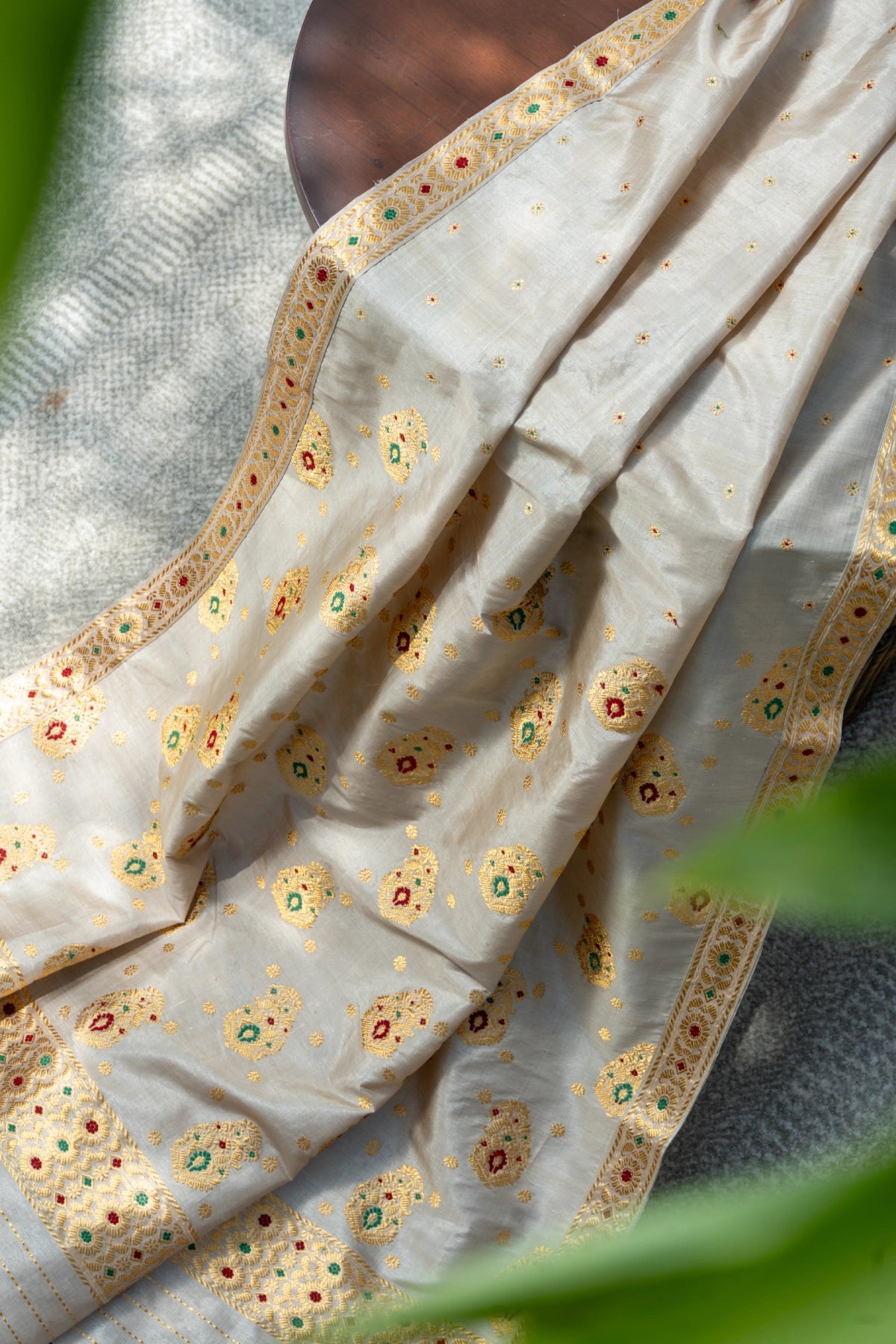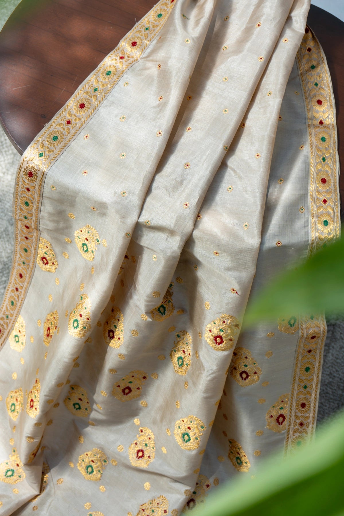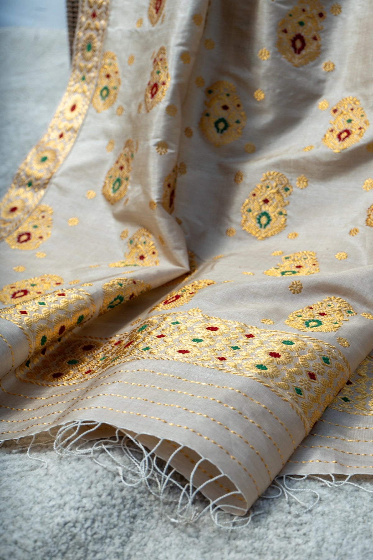 Tokou’s golden tussar silk feels like celebration woven into fabric. Regal gul buta motifs bloom in rows along the border, while the body is dotted with elegant kolkas, detailed in gold, red, and green meena.