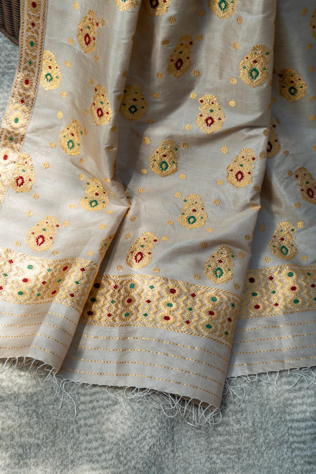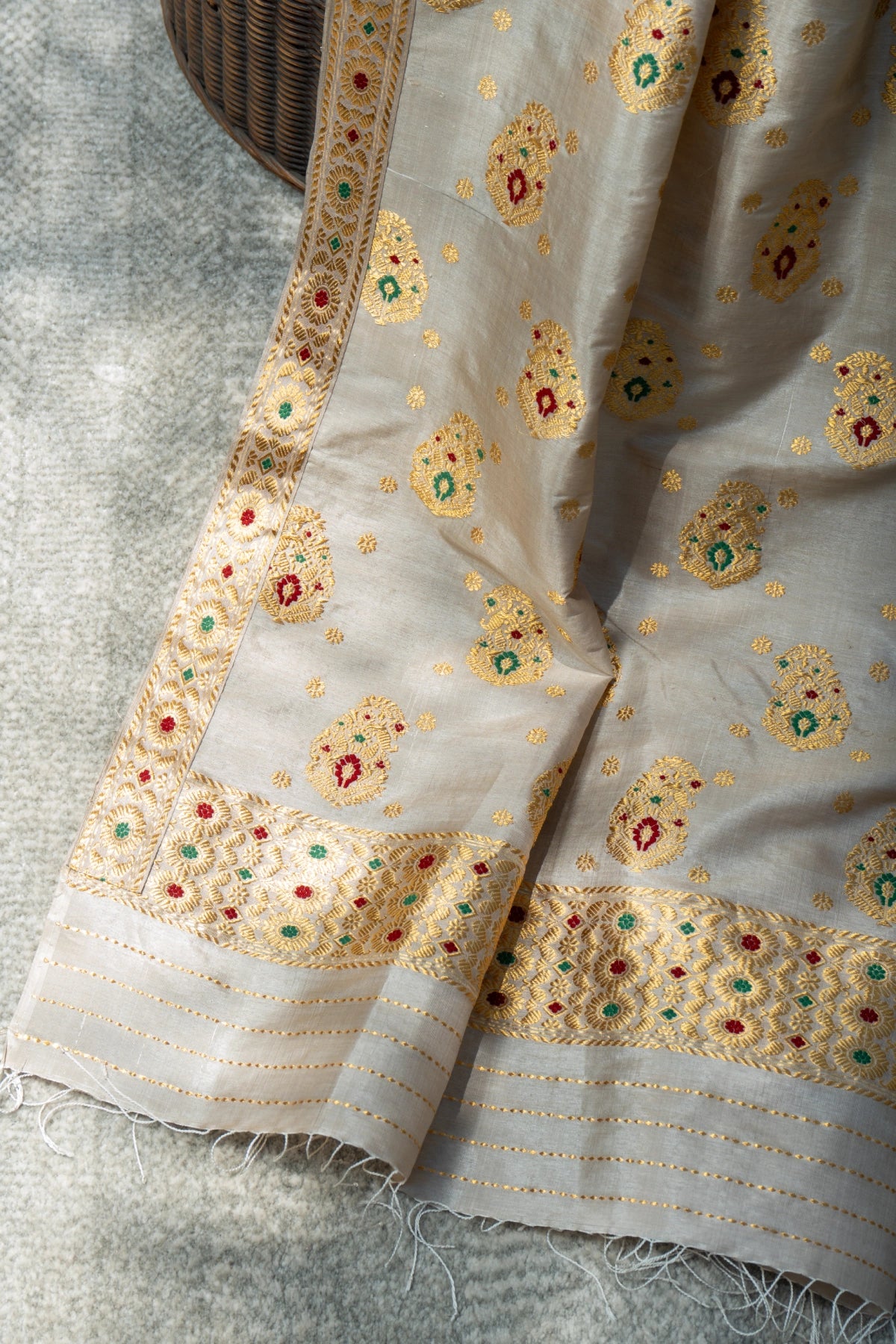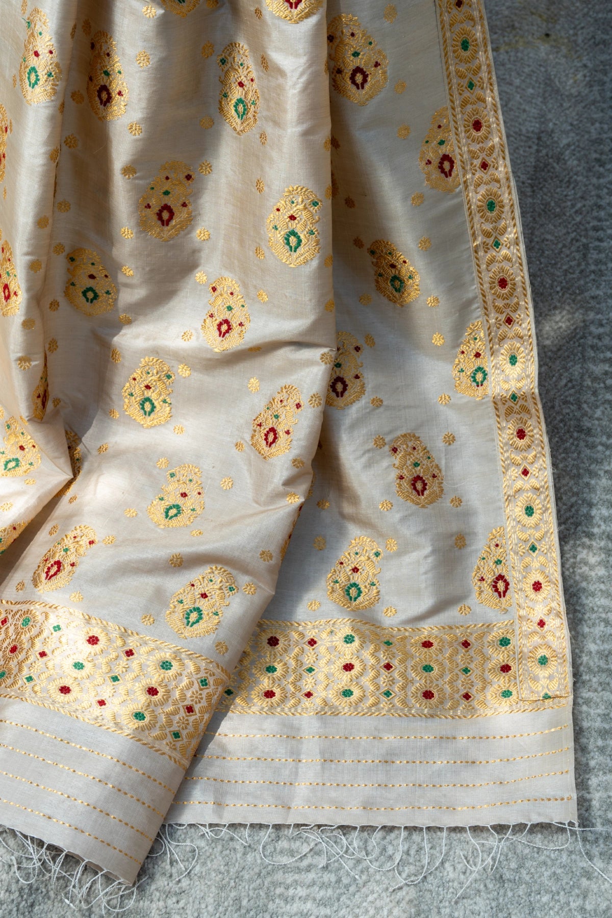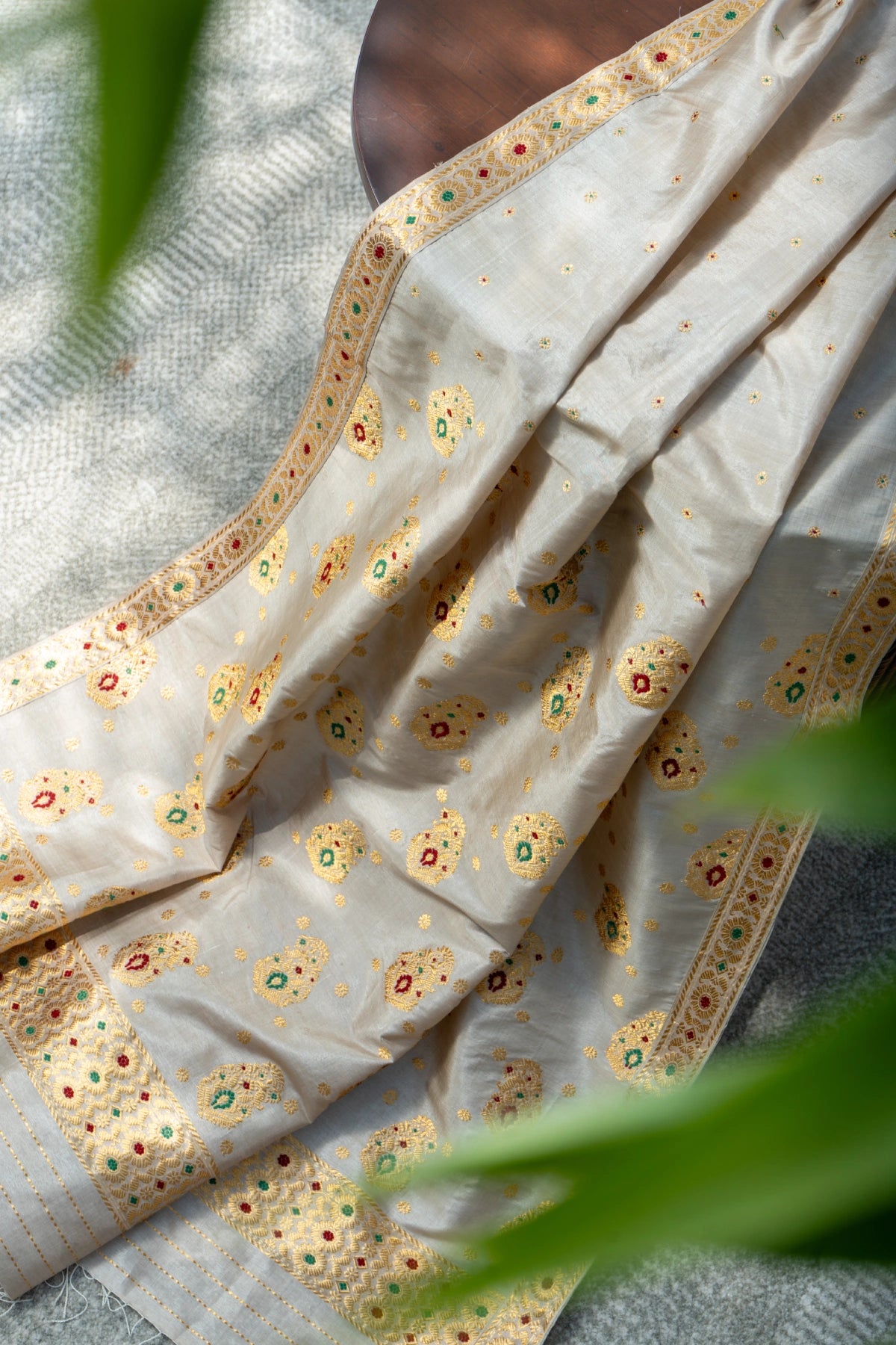 Tokou’s golden tussar silk feels like celebration woven into fabric. Regal gul buta motifs bloom in rows along the border, while the body is dotted with elegant kolkas, detailed in gold, red, and green meena.