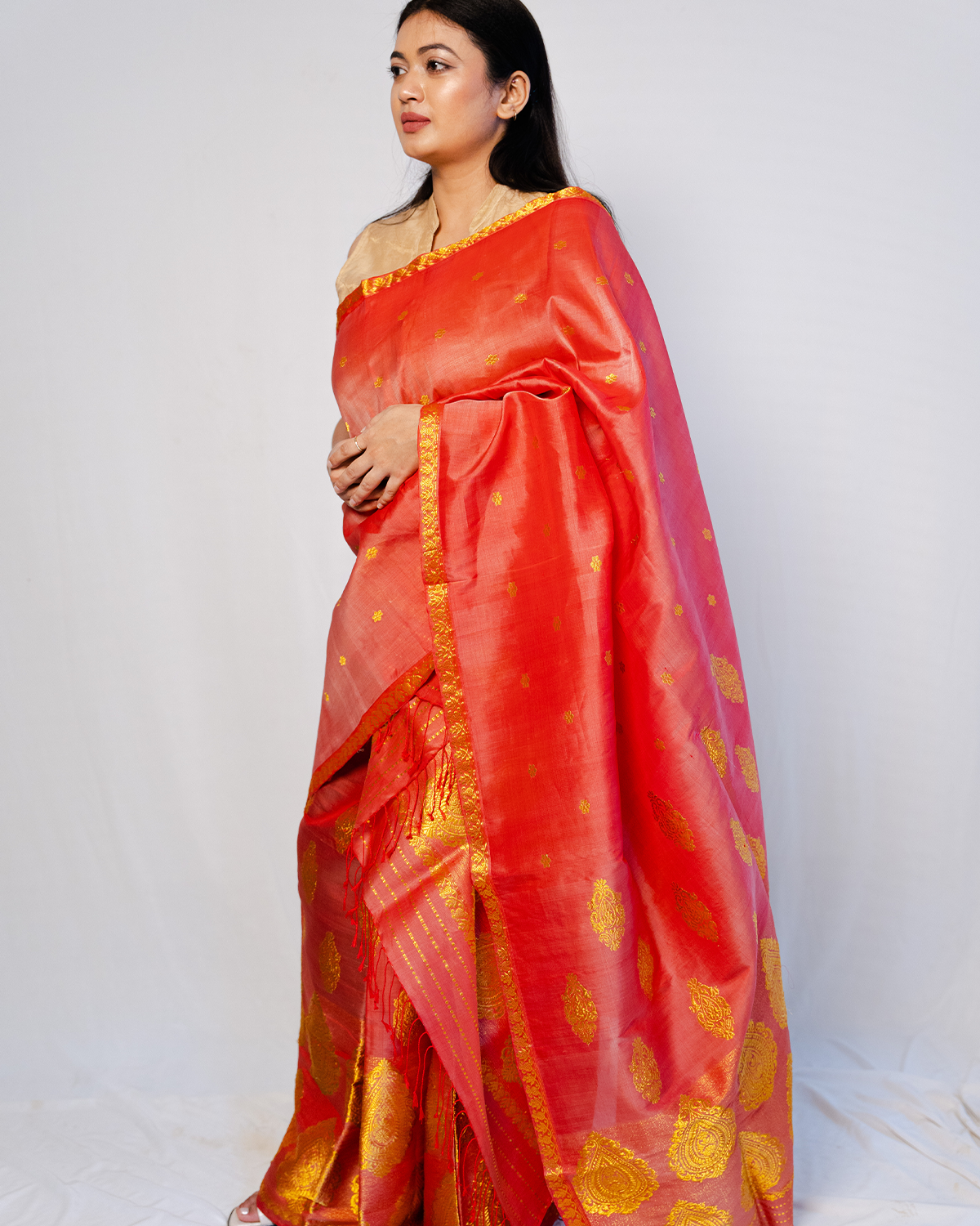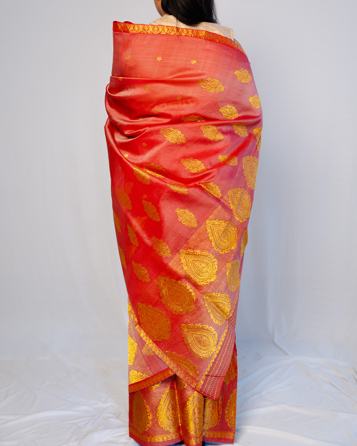 Experience boundless royalty with our Ziva red-gold kesa paat/mulberry raw silk mekhela sador with hingkhap kakhori and hingkhap phool.